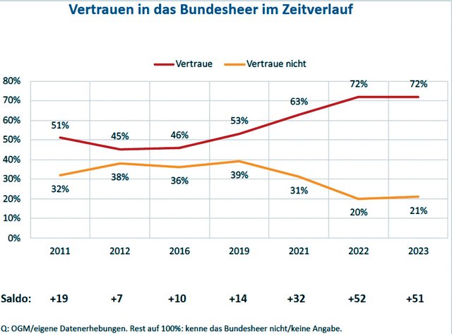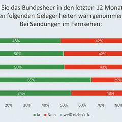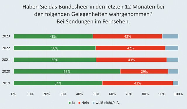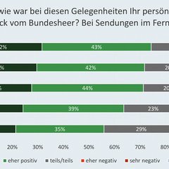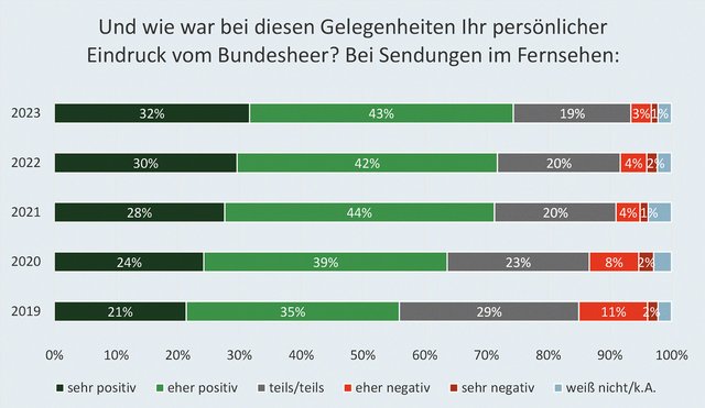 Die Bewertung der Befragungen durch die Abteilung Zielgruppenkommunikation des BMLV liest sich wie folgt: „Sofern Personen das ÖBH bei Sendungen im Fernsehen wahrgenommen haben, ist der Eindruck im Jahr 2023 für ¾ der Befragten positiv. Im Vergleich zu 2019 ist der Anteil an Personen, die einen positiven Eindruck vom ÖBH im Rahmen von Fernsehsendungen berichten, um nahezu 20 Prozent gestiegen. Zwischen einem positiven Eindruck vom ÖBH im Rahmen von Fernsehsendungen und weiteren Einstellungen zum ÖBH bestehen statistisch nachweisbare Zusammenhänge. So berichten Personen, die einen positiven Eindruck angeben, insbesondere von einem höheren Vertrauen in das ÖBH, bewerten die Leistungen des ÖBH im Rahmen der militärischen Landesverteidigung besser und beurteilen das öffentliche Auftreten der Soldaten besser. Insgesamt ist somit ein substanzieller und wissenschaftlich nachweisbarer Imagegewinn durch die Präsenz der ÖBH-Vertreter in Fernsehsendungen zu verzeichnen.“