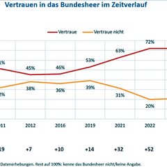 Die Experten waren gerade zu Beginn des Krieges omnipräsent. Und dies spiegelte sich auch in der öffentlichen Wahrnehmung wider: Eine Befragung von 1.406 Österreichern durch das BMLV zur öffentlichen Wahrnehmung des Bundesheeres im Fernsehen wurden erfragt (Abbildung 1) und wie ihr persönlicher Eindruck dazu war (Abbildung 2). Zusätzlich zeigte der OGM-Vertrauensindex (Österreichische Gesellschaft für Marketing) einen deutlichen Vertrauenszuwachs in das ÖBH. OGM kommentiert diese Entwicklung wie folgt: „2022 kam es im Gefolge des russischen Angriffskrieges zu einem Vertrauens-Boost in das Bundesheer, dazu haben auch gelungene Medienauftritte hochrangiger Militärs beigetragen.“
