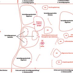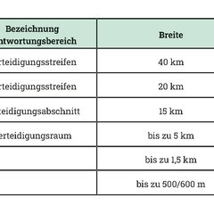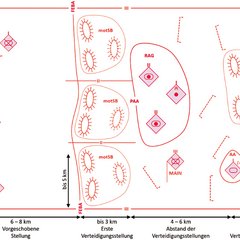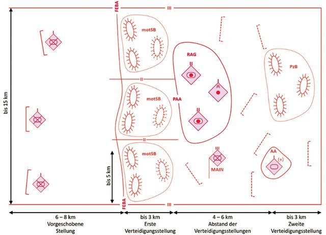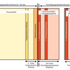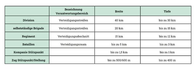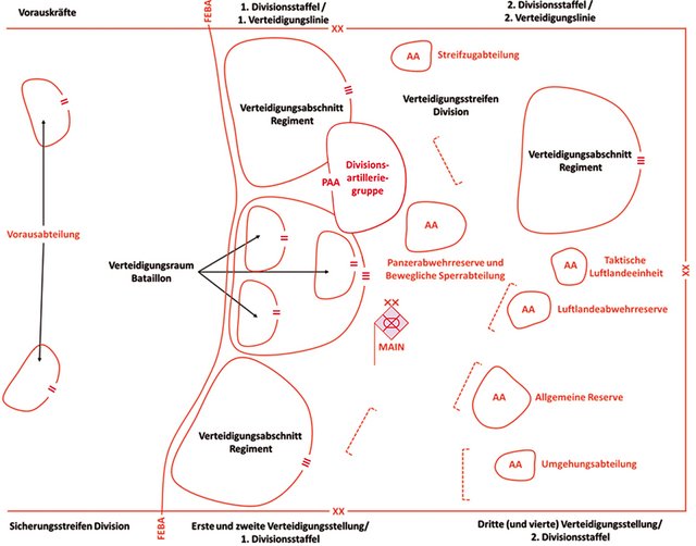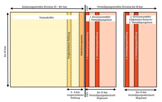Die räumliche Gefechtsordnung für eine Stellungsverteidigung einer motorisierten Schützendivision besteht aus dem unmittelbar feindzugewandten Sicherungsstreifen der Division zum anfänglichen Verzögern und Abnutzen des Angreifers sowie dem nachfolgenden Verteidigungsstreifen der Division zur Abwehr des Angriffs.