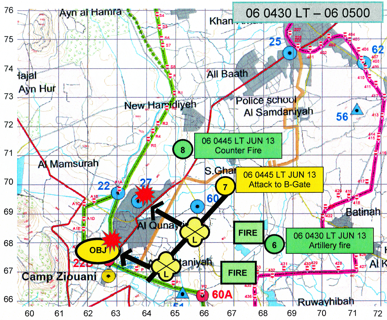 7) Ab ca. 0445 Uhr erfolgt dann der Ansatz der Rebellen über zwei Stoßrichtungen - eine Richtung Al Qunaytirah mit dem vermutlichen Ziel des Abriegelns von Gegenangriffen und eine Richtung B-Gate zum Nehmen dieses Raumes.