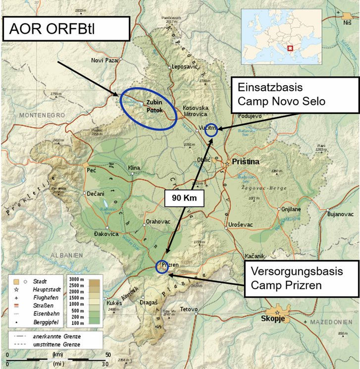 Parallel zur Aufnahme und zum Herstellen der vollen Einsatzbereitschaft erfolgte die Auftragserteilung durch den COM KFOR an den Kommandanten des ORFBtl II/2011 sowie die Befehlsausgabe für die Einsatzführung des Bataillons. Die erste Einsatzbereitschaft wurde termingerecht nach vier Tagen erreicht, die volle drei Tage später. Da sich der geplante Operationsraum im Nordosten des Kosovo befand, wurde entschieden, alle Einsatzkräfte in das französische Feldlager Novo Selo zu verlegen und die logistischen Kräfte im Feldlager Prizren zu belassen. Dies führte zu extrem überdehnten Versorgungswegen, die bei den bestehenden Straßenverhältnissen LKW-Fahrzeiten von fünf bis sechs Stunden bedeuteten. Diese logistische Überdehnung bestand während des gesamten Einsatzes des Verbandes. Zur Aufrechterhaltung der Versorgung der Einsatzkräfte wurde mit einem 24/7-Logistikkonzept versucht, die Einsatzbereitschaft ununterbrochen zu gewährleisten. Dazu wurde auch eine vorgeschobene logistische Basis eingerichtet. Eine erste große Herausforderung war die im Camp Novo Selo fehlende Infrastruktur für die Einsatzkräfte des Bataillons. Deutsche Logistikkräfte konnten innerhalb des Camps schließlich ein Zeltlager zur Unterbringung von zwei Einsatzkompanien errichten. Dieses Lager wurde für ein halbes Jahr die „Heimat“ des Bataillons. Der COM KFOR hatte entschieden, dass das ORFBtl II/2011 die taktische Reserve der KFOR ablösen sollte, um nach dessen Herauslösen dieses Reservebataillon wieder als schnelle Eingreiftruppe verfügbar zu halten. Der Verantwortungsbereich (Area of Responsibility – AOR) umfasste den Raum rund um die Stadt Zubin Potok einschließlich der Hauptbewegungslinie „HEN“ und des Grenzüberganges „DOG 31“. Die AOR hatte damit eine Ausdehnung von ca. 25 x 20 km. Die stationär zur Sicherung des „DOG 31“ eingesetzte französische Einsatzkompanie wurde für die weitere Einsatzführung dem ORFBtl auf Zusammenarbeit angewiesen. Die Übernahme der Raumverantwortung dauerte rund 48 Stunden.