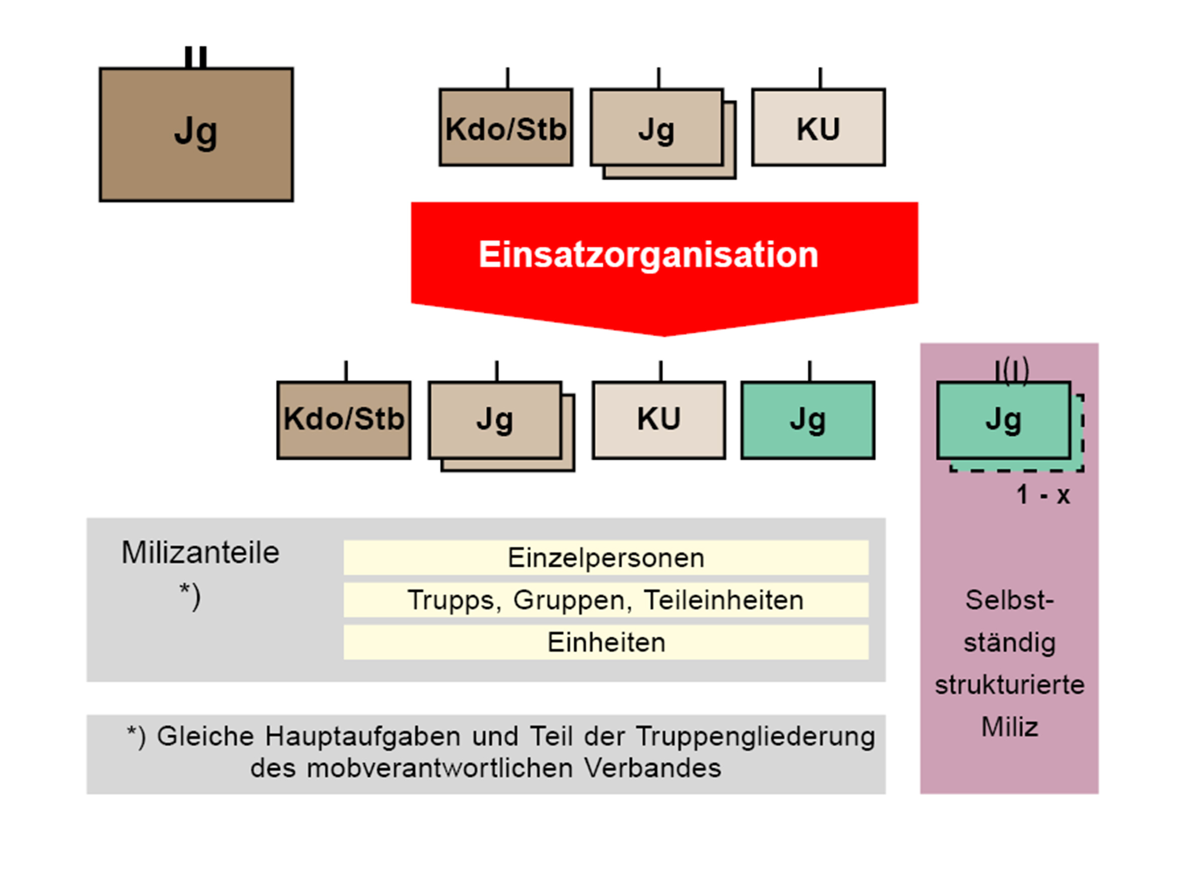 - die selbstständig strukturierte Miliz in Form der Jägerbataillone, der Jägerkompanien, der Pionierkompanien, anteiliger Fernmelde-, Sanitäts- und Versorgungszüge, einer Katastrophenhilfeeinheit/AFDRU, ein Versorgungsbataillon und
