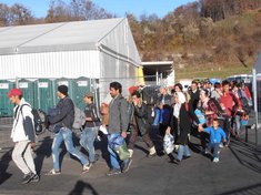 Sobald ein Bus ankommt, werden die Flüchtlinge, die sich im ersten Bereich aufhalten, hinausgeleitet und nehmen darin Platz. Danach rücken die Personen vom zweiten in den ersten Bereich nach usw. Dadurch ist gewährleistet, dass jeder im Warteraum weiß, wann er an der Reihe ist. Für die Ruhe vor Ort ist das entscheidend. Kurz gesagt: Es muss immer eine Bewegung in Richtung Ausgang erkennbar sein. Die Flüchtlinge müssen immer sehen, dass sie aus dem Grenzbereich kommen und ihre Reise weitergeht, dann bleiben sie ruhig und die Situation entspannt. Die Busse transportieren die Menschen in ein Erstaufnahmezentrum, eine andere Sammelstelle oder direkt an die deutsche Grenze. Für die meisten Flüchtlinge ist Deutschland das Wunschziel.