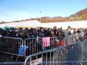 Nach der Versorgung mit Lebensmitteln werden die Menschen in Zelte geführt. Dort ist der erste Wartebereich. Die Zelte haben einen Holzboden und sind beheizt. In der Mitte ist ein etwa fünf Meter breiter Gang. Links und rechts davon sind Bereiche für etwa 50 Personen. Diese sind mit hüfthohen Gittern abgegrenzt. In dieserZone warten die Menschen auf die nächste Station. Sie nutzen die Zeit, um zu essen, zu schlafen oder sich zu unterhalten und mit ihren Kindern zu spielen. Die Flüchtlinge wirken ruhig und besonnen.