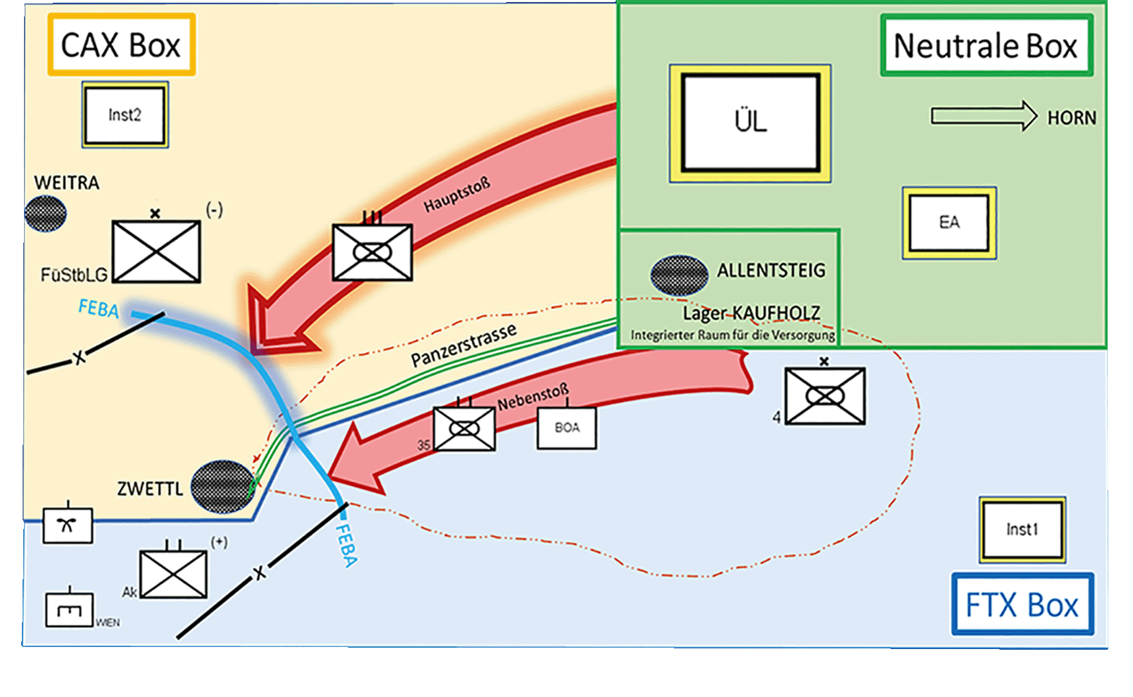 In dieser Box befanden sich alle Teilnehmer, die für die Übungsleitung oder die Echtzeitauswertung verantwortlich waren. Ihre Aufgabe war es, den reibungslosen Ablauf der Übung zu gewährleisten. Der Übungsleitungsgefechtsstand befand sich im Lager Kaufholz auf dem TÜPl Allentsteig.