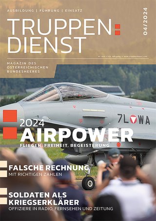 In dieser Ausgabe des TRUPPENDIENST-Heftes finden Sie ein breites Themenspektrum. Wir berichten unter anderem über die AIRPOWER24, die am 6. und 7. September 2024 stattfand ‒ mit Vorführungen der österreichischen Luftstreitkräfte und international…